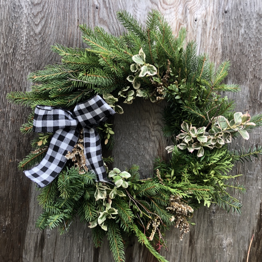 Handcrafted from fresh spruce, yew, boxwood, euonymous, goldenrod, and dogwood, and finished with a checkered plaid bow. (approx 16″ or 24″ outside diameter)
